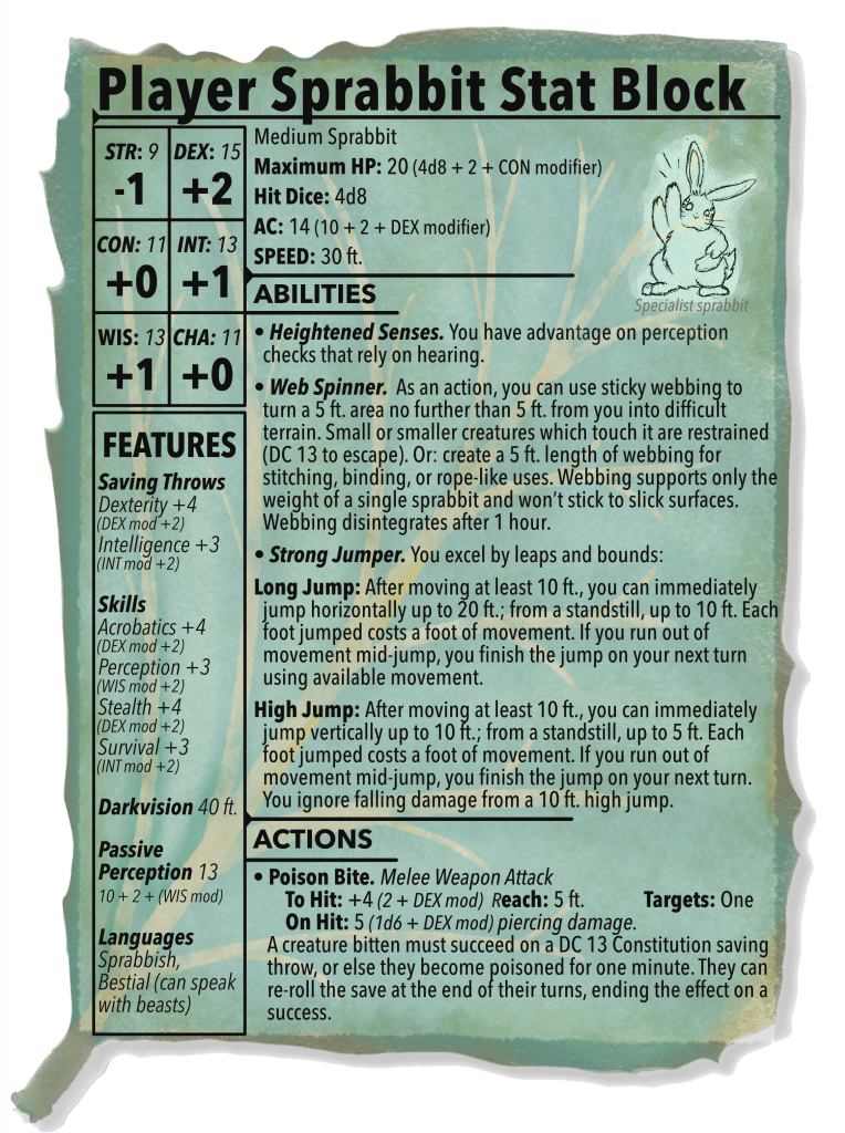 Player sprabbit characters have no levels, beginning with the same stats. Players record them using standard 5e character sheets. Players will customize their sprabbit by choosing one trait from the Sprabbit Traits table and one feat from the Sprabbit Feats table. Please note that sprabbits typically use Dexterity for the bonus to their attack rolls and damage rolls.